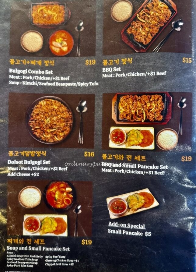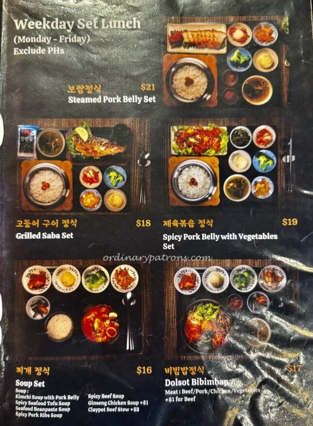 The full restaurant menu is available online so I will only show you the Wang Dae Bak Holland Village weekday set lunch menu. The items here look like good value for money and we decided to order the Pork BBQ and small pancake set ($19++) and the Ginseng Chicken Soup and small pancake set ($20++),
