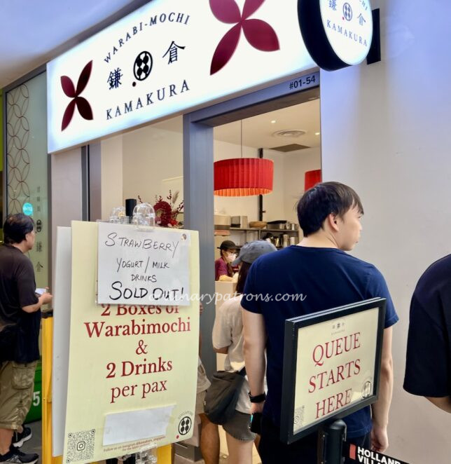 Warabimochi Kamakura Holland Village is a small little shop. The queue was long but orderly. The atmosphere in the shop was calm as the people waited for their turn. The strawberry yogurt / milk drinks seem to be the most popular and was sold out quite early.