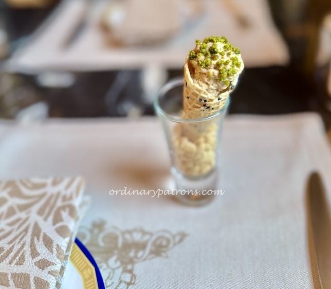 It seems that the ‘correct’ approach to eating afternoon tea is to have the savoury items followed by the sweet. In our case with the top tier sweet pastries serving the role of dessert. Prior to the arrival of the 3-tier tray, a small cone was served first. That probably served as an amuse bouche.