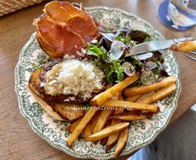 The burger was served open-faced, which is a good idea as it makes cutting with a knife easier. Together with parmesan cheese, crispy Bayonne ham, homemade fries and onion chutney, the beefy homemade patty combined to make a very good burger indeed.