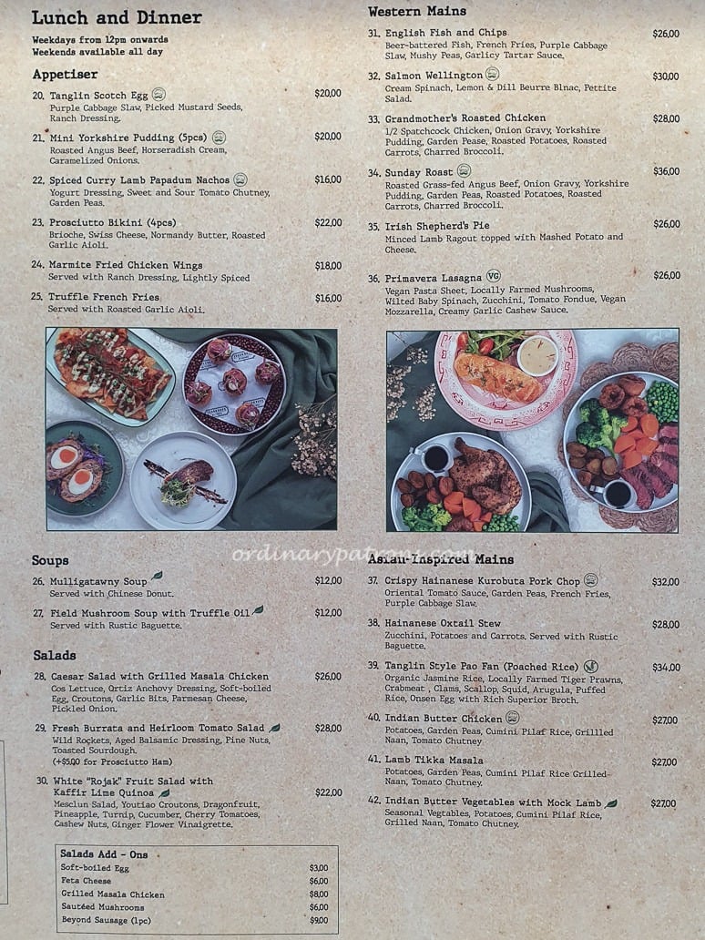 Tanglin Cookhouse’s menu reflects the diverse influences that shaped Singapore’s cuisine during colonial times. Alongside classic British fare like Scotch Eggs, Yorkshire Puddings and Fish & Chips, we also see dishes like Hainanese Pork Chop and Indian Butter Chicken. There are also sandwiches and pastas. Vegan options are available.