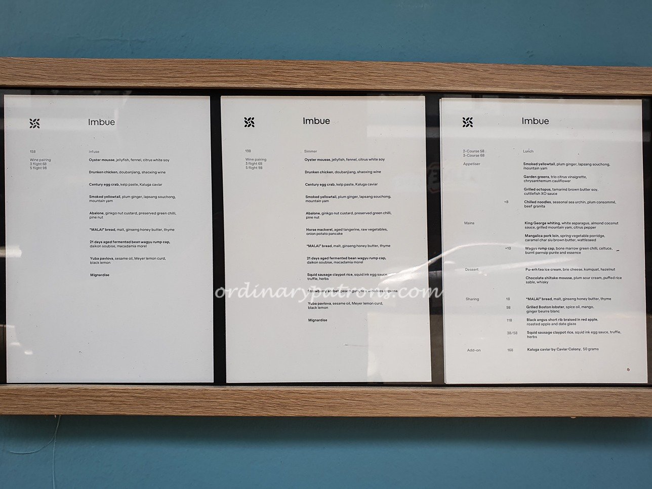 Imbue offers lunch and dinner set menus. The lunch menu is reasonably affordable, with a two-course option at $58++ and a three-course option for $68++. Dinner is a more extravagant affair, with a five-course tasting menu at $158++ and an eight-course Simmer menu for $198++.