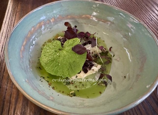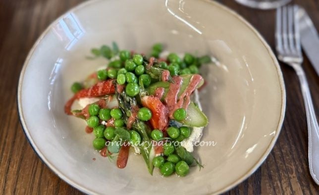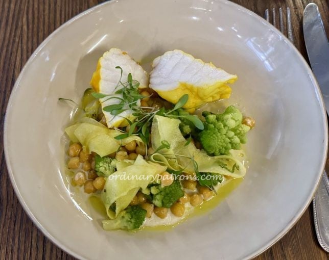 Our picks of starters for lunch were green asparagus with peas, tarragon whipped ricotta, sumac and strawberry condiment (picture above €15) and crab-stuffed kohlrabi raviole (€12). Both were dishes with light flavouring, enabling us to taste the freshness of the ingredients.