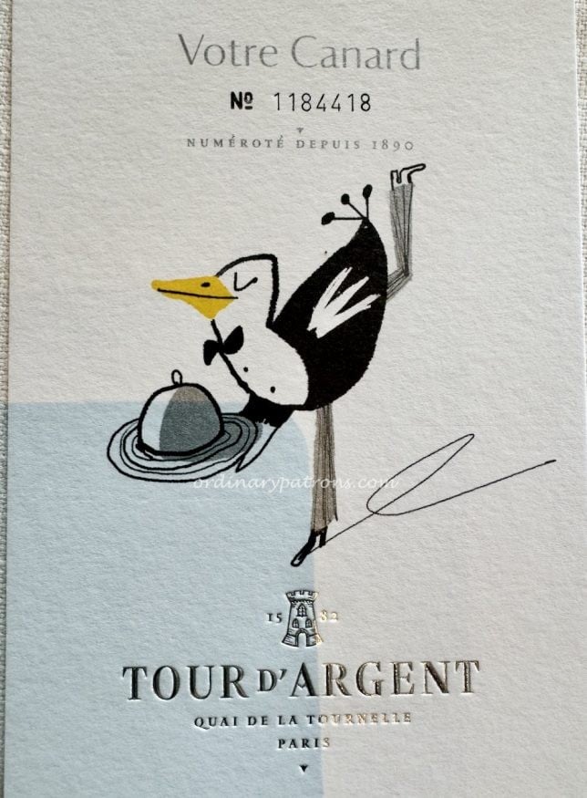 The restaurant has a tradition of tracking the number of ducks served since the days of Frรฉdรฉric Delair in around 1890. Our duck was no. 1,184,418. This card was presented to as a momento at the end of our meal.