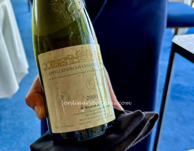 We stopped searching at one of the earliest ‘chapters’ of the book – Loire Vallery wines. These are one of our favourite types to order at restaurants as these are usually consistently good and relatively affordable. A bottle of 2000 Nicolas Joly Savennieres caught our eye as we have not seen this before. We have also not ordered such as old bottle of white wine at a restaurant. There was a possibility that it was past its prime. It was a risk worth taking with its relatively low price of 120 euros.