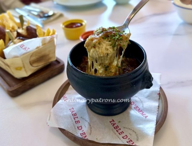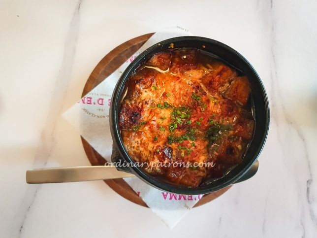 Next was a more familiar dish – French onion soup ($22). This one was less impressive. The Gruyère cheese was fine – sticky and gooey. But the soup was too sweet for our liking and we wished that the onion taste was more intense.