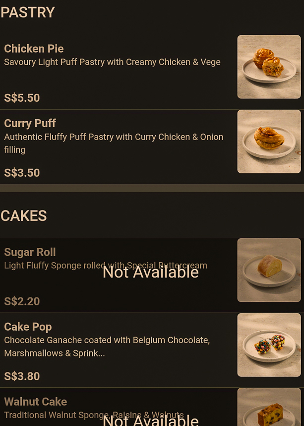 There are cakes, pastries, curry puffs and pies on display at the counter.
