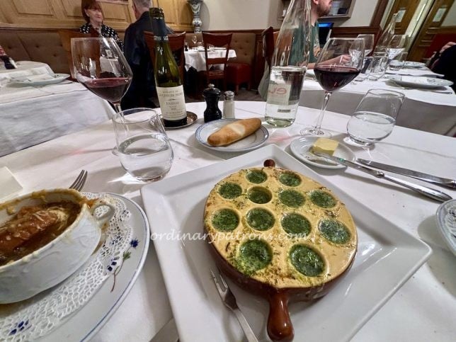 Here are pictures of some pages from the Le Soufflé Paris menu and wine list. With soufflé being the star at this restaurant, it was easy to decide what to eat. The only decisions to be made were the side dishes (if any) and the flavours of the soufflé. In the end we decided to try a couple of French culinary classics – onion soup and escargots. We also decided on two soufflé dishes – one savoury and one sweet.