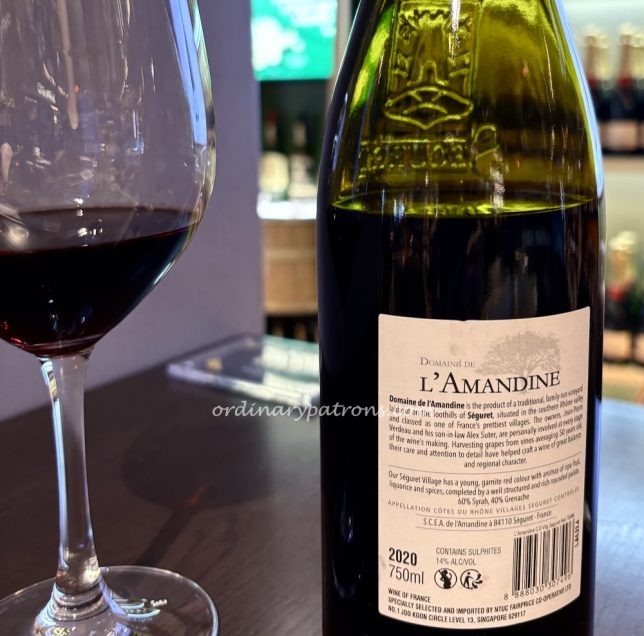 Our choice of wine was a bottle of red wine from the Rhone Valley, France. The 2020 Domaine L’Amandine ($29.90 + corkage $8) was fruity and uncomplicated – very good considering the price.