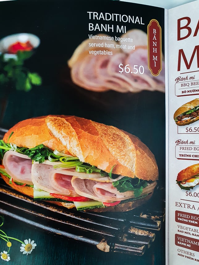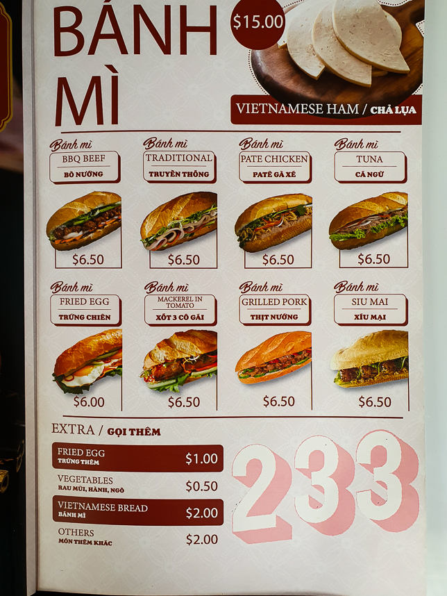 Below are pictures of pages from the regular menu of 233 Banh Mi.