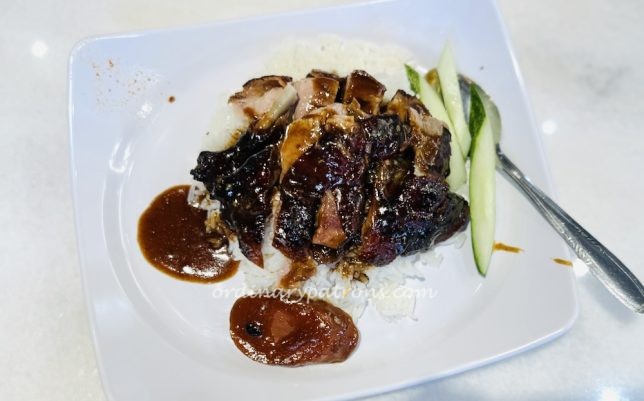 This is a picture of the roast duck drumstick rice with the drumstick deboned . Similar to the char siew, the duck skin was heavily charred but the insides were ok.