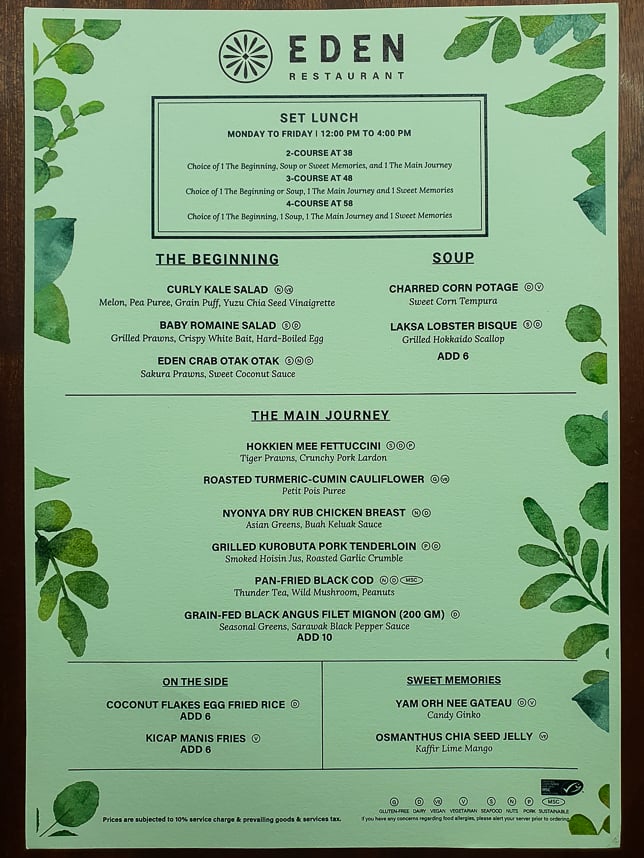 Eden’s menu is a delightful fusion of familiar Asian flavours with interesting twists. There are playful takes on Singaporean classics like the Chilli Crab Bao Bun and Kam Heong Grilled Octopus. There are also simple traditional grilled items including Black Angus Beef and Australian Lamb. Below is a picture of the menu of Eden Restaurant for lunch and dinner.