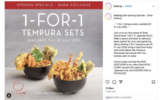 Here are some information available on the Tenjin Facebook page at the time of writing of this post. When we visited the ‘old’ Tenjin, it was on the third floor (unit 03-08). The new address is now on level one (unit 01-11 Shaw Centre). As in most special deals, it has this qualification – “terms and conditions apply”. What these are, I do not know (other than the deadline of 31 July 2024), but the attractiveness of an 1-for-1 offer is hard to resist.