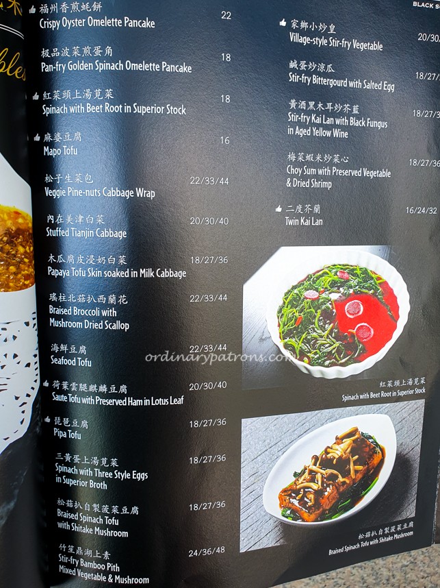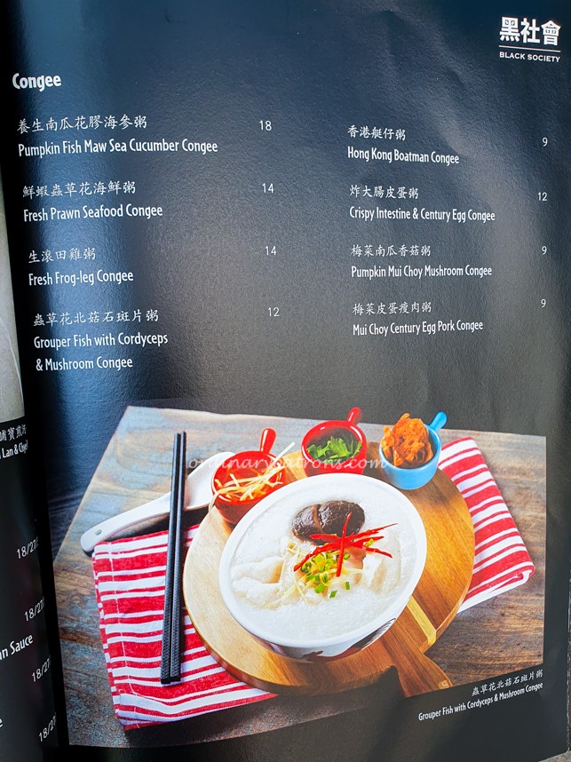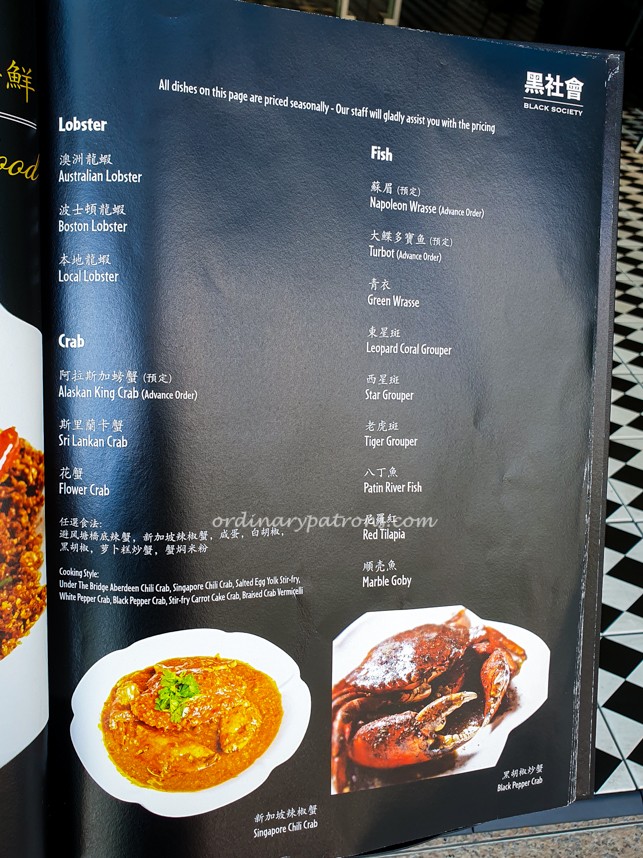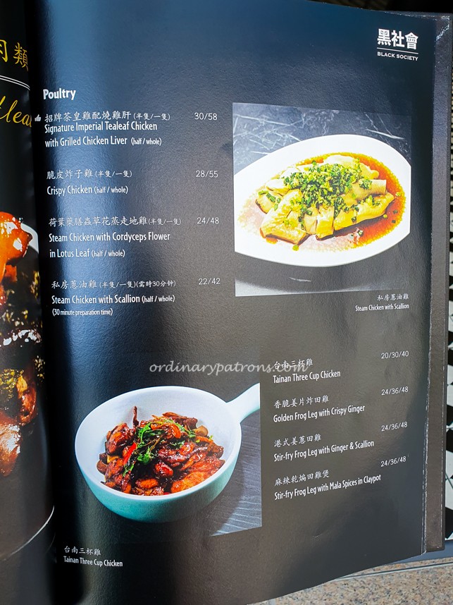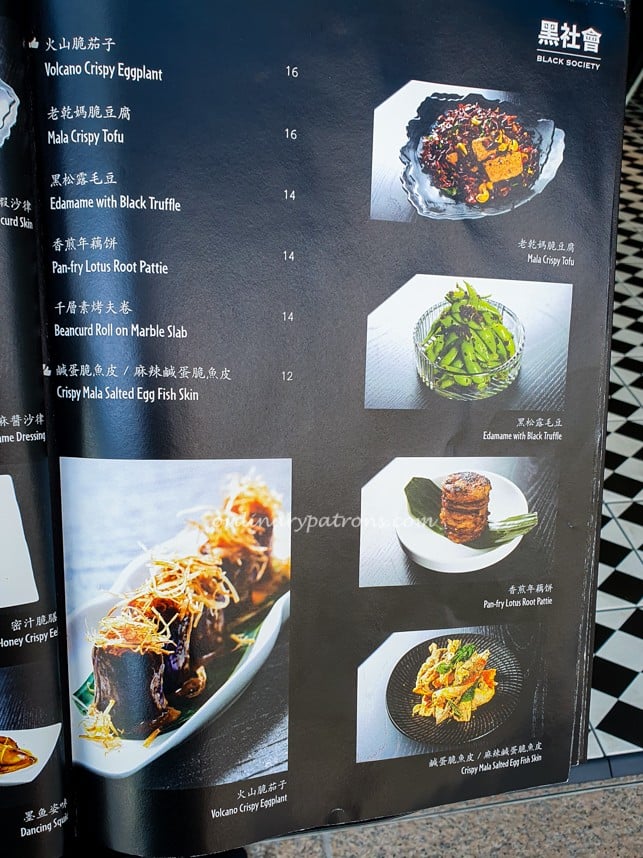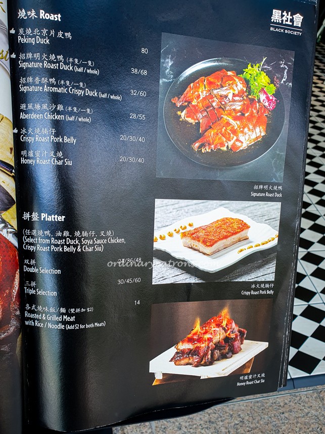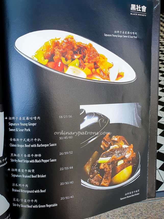 Black Society Restaurant offers modern Cantonese dishes with signature items such as Aromatic Crispy Duck, Mama Crab Noodle, Honey Grilled Spare Ribs, Frozen Kailan and Lobster Bisque Xiao Long Bao. Below are pictures of a few random pages of the main menu.