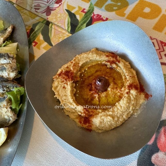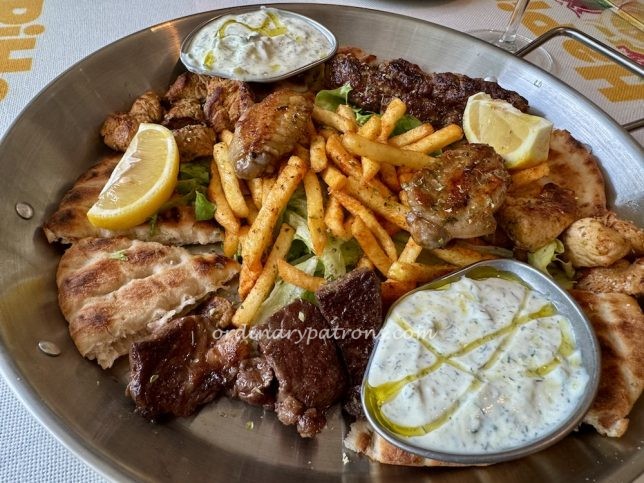 Ordering the meat platter was an easy option – to try out bite sized versions of various items on the menu. Our Meat Platter for 2 ($49.90) had small portions of Lamb Kofta, Beef Cevapi, Chicken Souvlaki, Pork Souvlaki, and Mediterranean Chicken Lemon Wings, served with Pita Bread and crispy French-fries. Some yogurt dip (Tzatziki) was also provided. Each item was generally fine but it was hard to make any firm conclusions with just bite sized samplings. We should however say that the dip was very good and enhanced the flavour of every item on the plate and even the sardines.