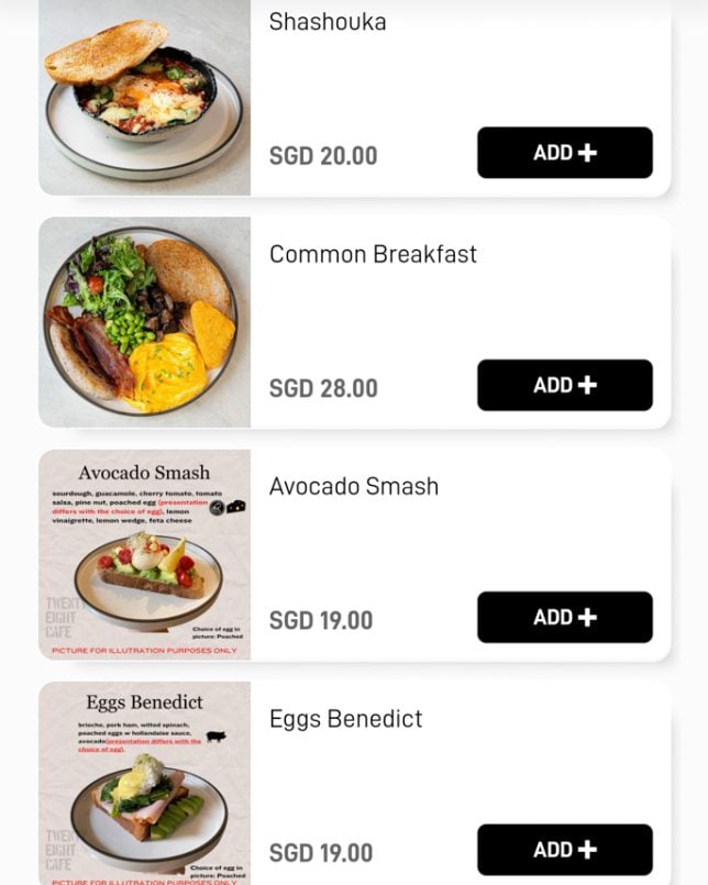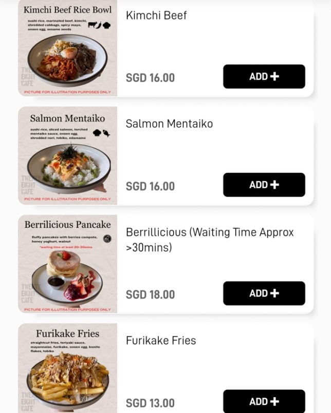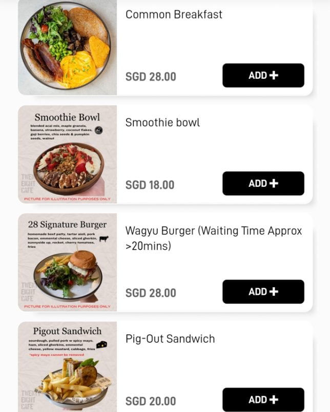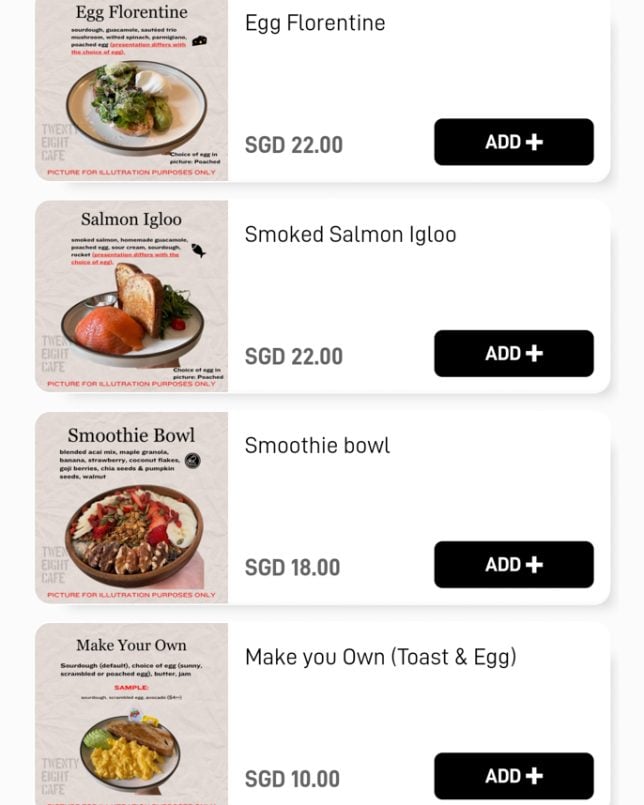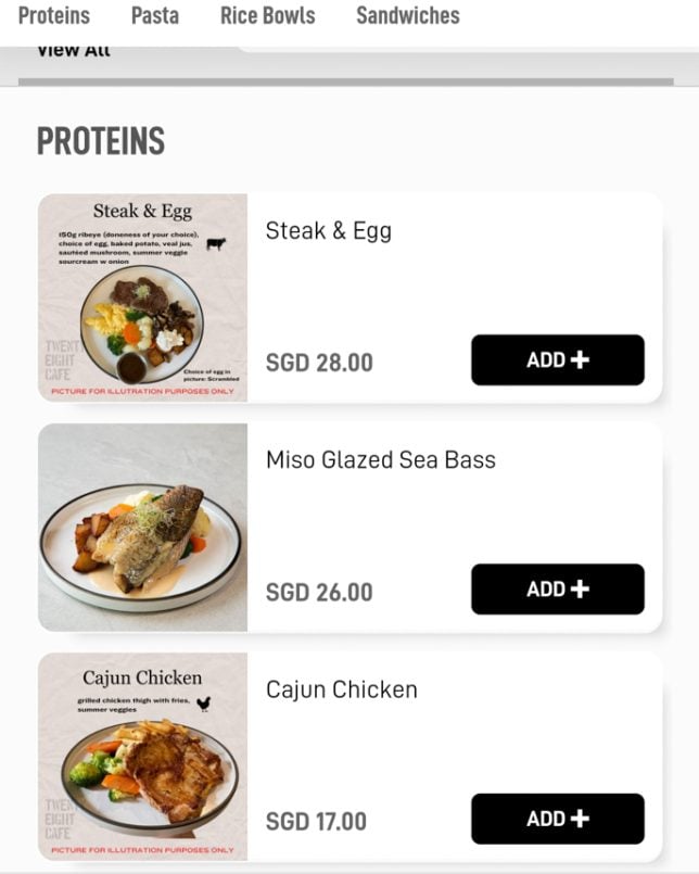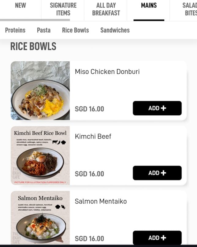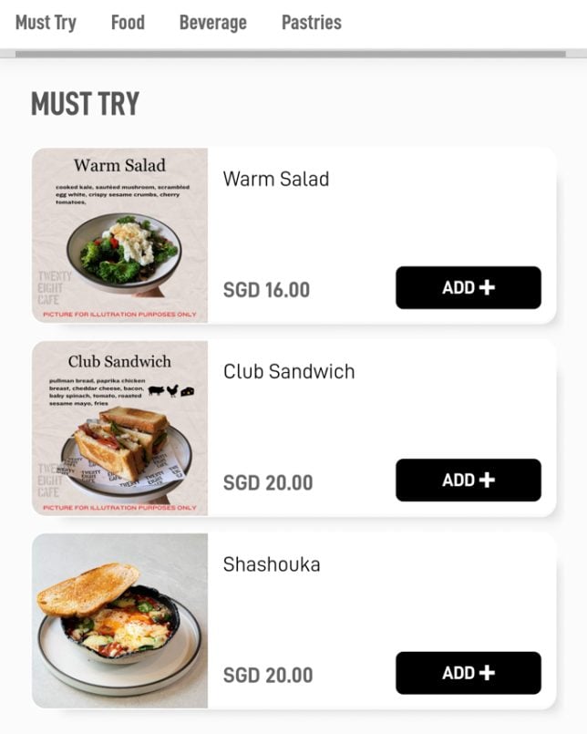Besides the cakes and pastries on display, Twenty Eight Cafe offers a good selection of typical cafe dishes. The menu features a “Must Try” section, which includes items like Warm Salad and Shashouka. In the Mains section, you will find rice bowls such as Miso Chicken Donburi and Kimchi Beef Rice Bowl. Below are screenshots of the cafe’s digital menu.
