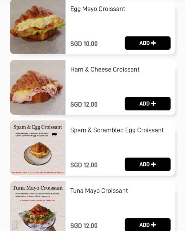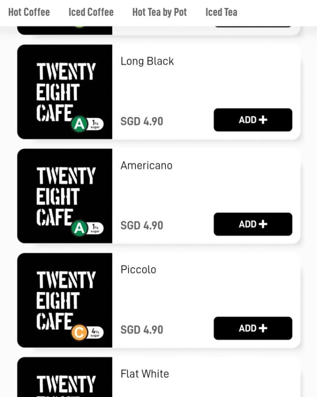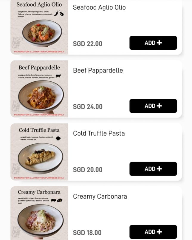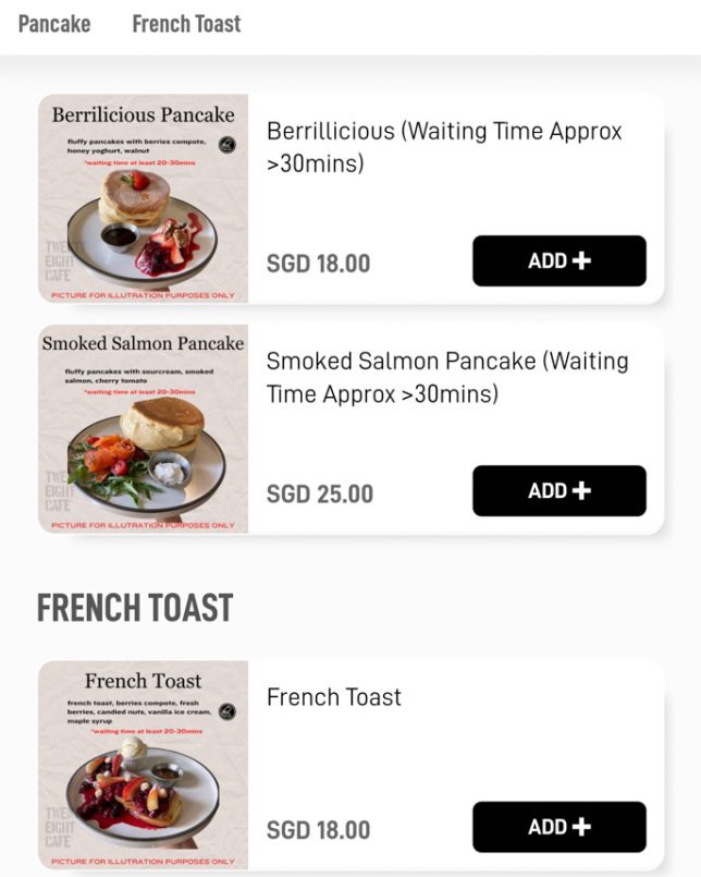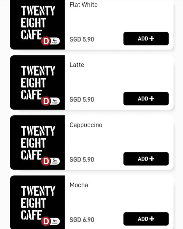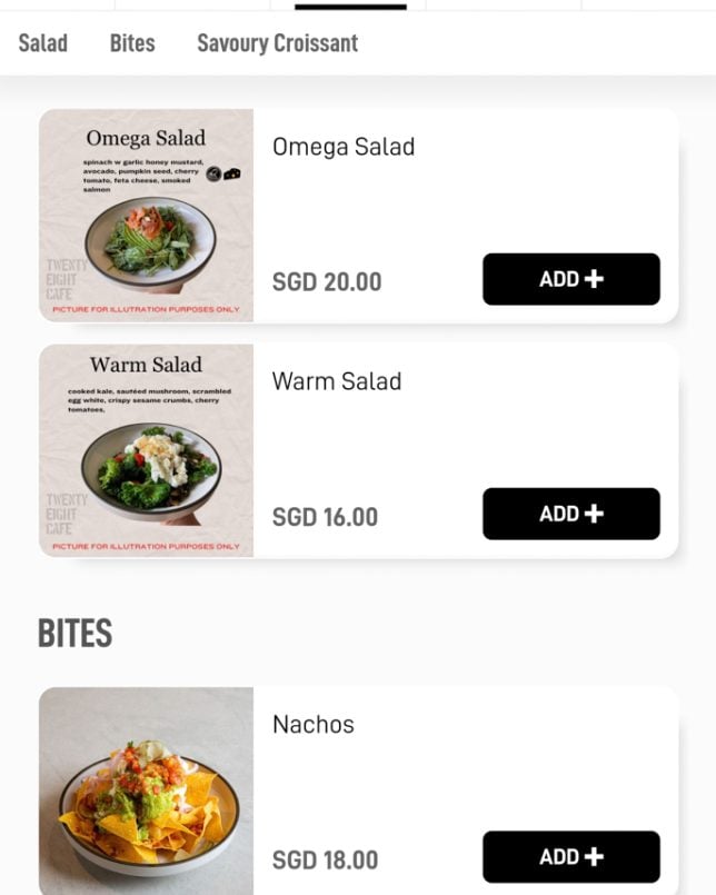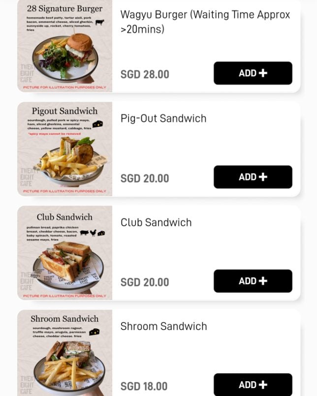 Besides the cakes and pastries on display, Twenty Eight Cafe offers a good selection of typical cafe dishes. The menu features a “Must Try” section, which includes items like Warm Salad and Shashouka. In the Mains section, you will find rice bowls such as Miso Chicken Donburi and Kimchi Beef Rice Bowl. Below are screenshots of the cafe’s digital menu.