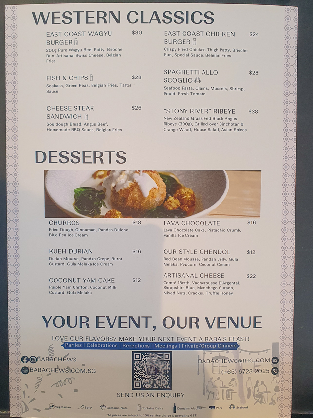 The menu of Baba Chews features contemporary Asian dishes like the Nikkei-inspired Grilled Assam Halibut and Singapore Chili Crab Risotto. Western classics like Fish and Chips and Ribeye Steak are also on the menu. There are also interesting desserts like churros and durian mousse.