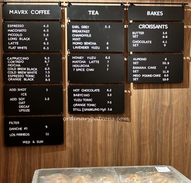 Here is a picture of the MAVRX coffee menu. On the menu are some tea choices and the usual coffee options such as Espresso and Macchiato ($4.50 each), Long Black ($6.00), Latte and Flat White ($6.50 each), Cappuccino ($6.50). A limited selection of croissants and cakes are available to go with the drinks.