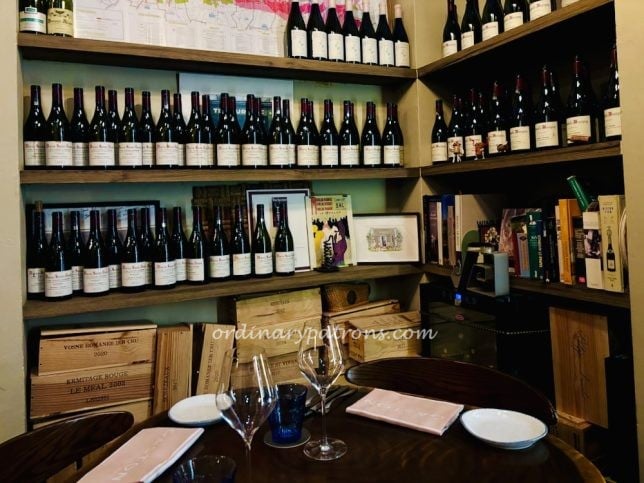 It was a full house on that day and noise levels were high. Don’t be fooled by the photos of empty seats here. They were taken at the end of dinner when most of the other diners had left. This may not be a French restaurant for those seeking a quiet romantic French dinner. But if a lively atmosphere is acceptable, there are some small tables suitable for couples such as this one next to the wine shelves.