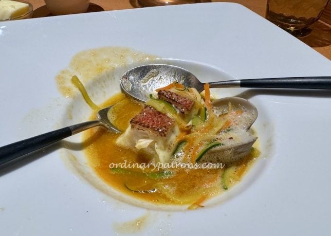 The last seafood item was chikamekintoki bouillabaisse. According to a quick internet research, this was a kind of bigeye snapper. This was as good as the preceding items, but even better as it was a more substantial dish. Oops we started eating before taking a picture. Here is a picture of a half-eaten dish :).