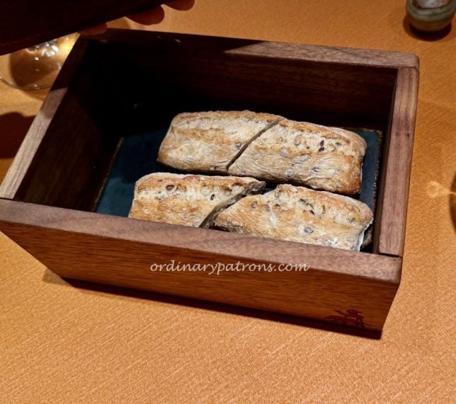 Warm bread was served in a warm wooden box. The box kept the bread nicely warm for some time. It was a good idea.