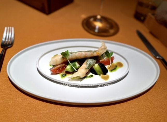 A crab and sea urchin dish in cauliflower gravy (picture above) started the ball rolling. Followed by a ‘shrimp tempura’ dish with curry and shiso leaf (picture below).