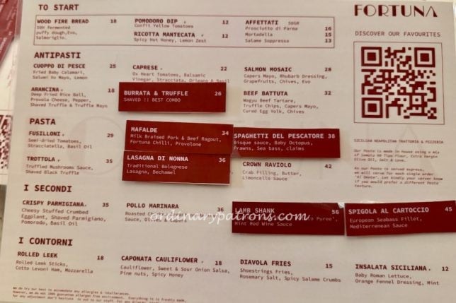 Quite a bit of information is provided on the pizza and pasta dishes on the website. The pizzas are said to use dough that undergoes a 50-hour fermentation process. As for the pasta, they are made fresh daily using Semola and 00 Tipo flour. Expectedly, these items take centrestage in the Fortuna restaurant menu.