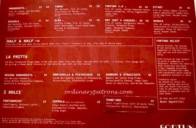 Here are pictures of the Fortuna Italian Restaurant menu. We were there during Christmas and some of the items may have been modified for the festive period.