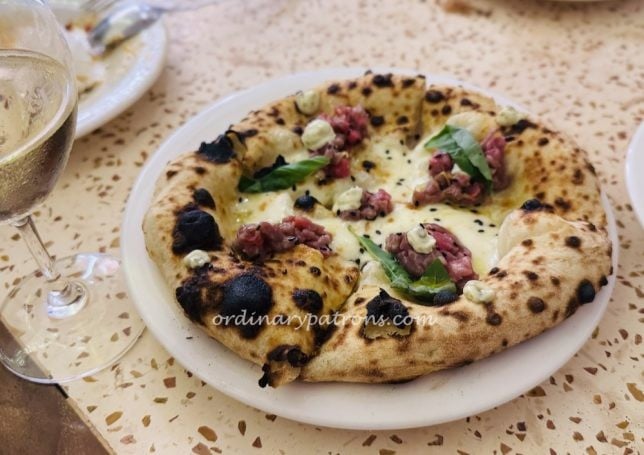 We tried the Sitari pizza piccola size ($35). This was pizza with Wagyu tartare toppings. Any concern about eating raw beef disappeared when the pizza arrived. The beef content was quite small and any meat flavour was hardly noticeable. The main star of the show was the dough, so we think it doesn’t matter what flavour, it will be nice because the crust is fluffy, light and crispy.