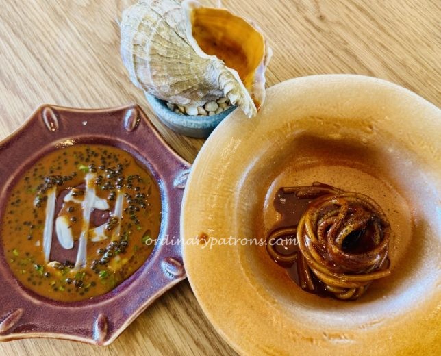 The next dish was described as slipper lobster, khorasen spaghettone and red carrot. Not paying attention in class was a shortcoming in my younger years in school. Unfortunately that might have resurfaced in this reconditioned school when our server explained the dish. I cannot recall where was the slipper lobster in this combination of dishes, perhaps parts of it may have been used in the sauce for the slices of shell fish. What I can remember is the carrot sauce was made with a very high carrot concentration. Ten kilograms of carrots go into making one kg of the sauce. It was certainly a concentrated complex sauce for the chewy Khorasan spaghettone (made of an unusual ancient Persian cereal).