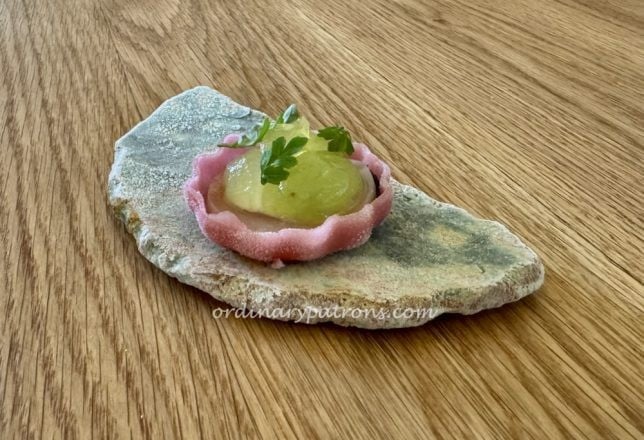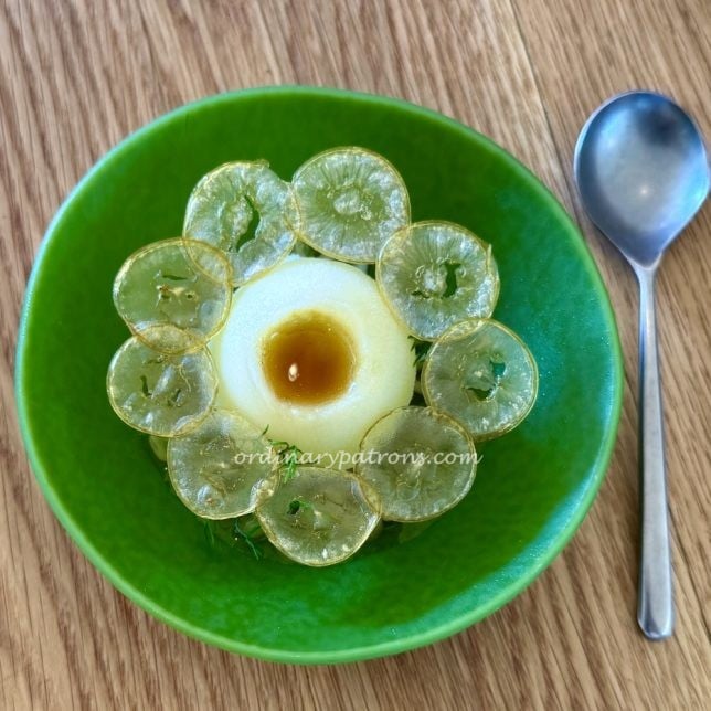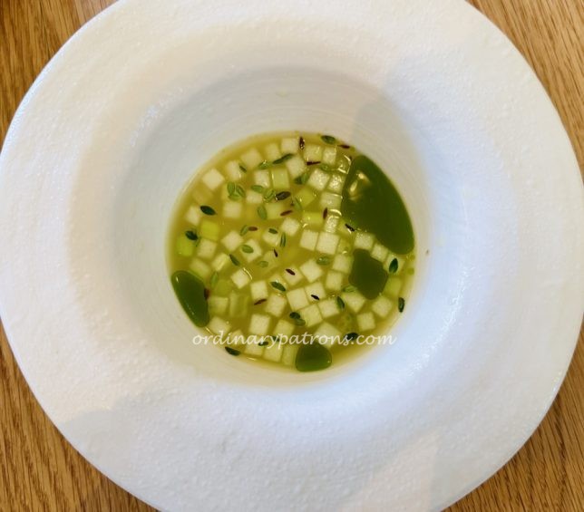 The stem turnip was the most distinctive dish of the day. The turnip had been hollowed out to contain tiny cubes of turnip, celery and apples. These were released into the cold soup when the plant was lifted. The result – a refreshing gazpacho on a hot Singapore afternoon.