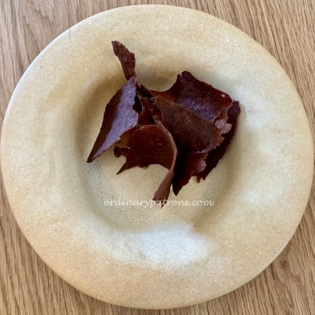 Dessert was buckwheat – whiskey – 75% single origin Tanzania. Flakes made of buckwheat and dark chocolate. A wonderful way to bring our lunch to an end. The dishes were small but many. But in the words of Depeche Mode, everything counts in large amounts. What it was all eaten and done, it was a satisfying lunch. Those with bigger appetites can proceed with the optional (add-on) cheese course.