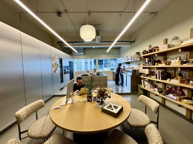 The main cooking takes place in an enclosed kitchen but some workstations (where food prep and light cooking are done) are located next to the dining area. A clever solution to provide a link between customers and cooking staff without the unwanted smells and sounds.