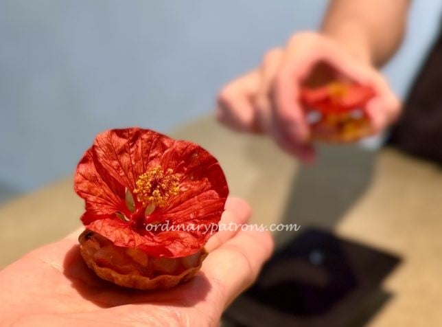 Next was raw shrimp served with a dried hibiscus flower. Both snacks were good and added to the fun factor of the dining experience.