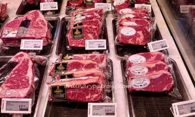 When we go for lunch, the Culina Market meat and fish sections are the most interesting to us. Items here can be picked to be cooked and served at the Bistro. There is a preparation fee of $18 to $28 depending on the size of the meat or fish. For this visit, we picked a piece of Great Southern Pinnacle Beef ribeye steak ($14.75 per 100g). Together with the $18 prep fee, the 350g steak costs a total of around $70.