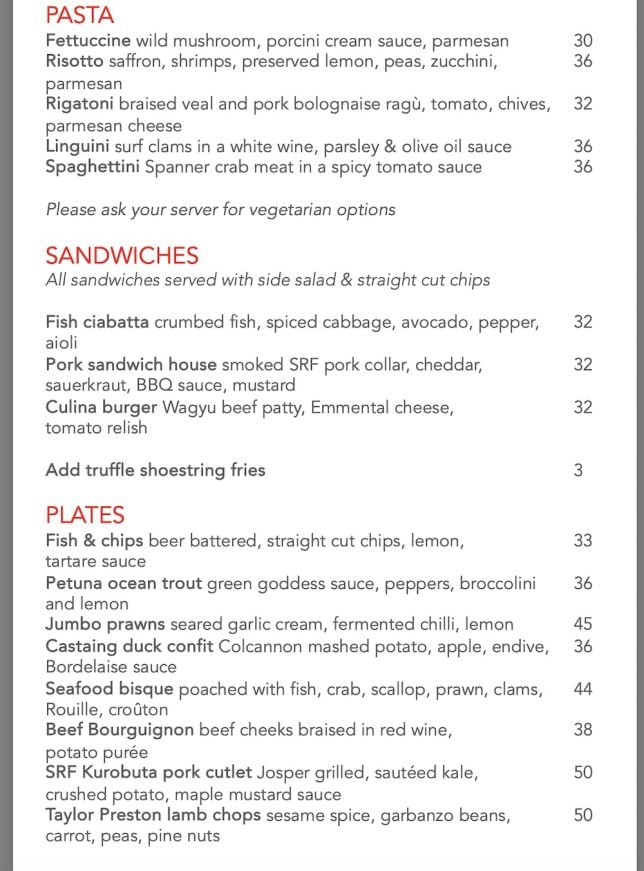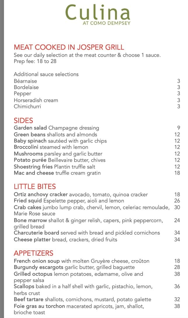 Here are pictures of some sections of the Culina Menu. A full menu is available online (link below).
