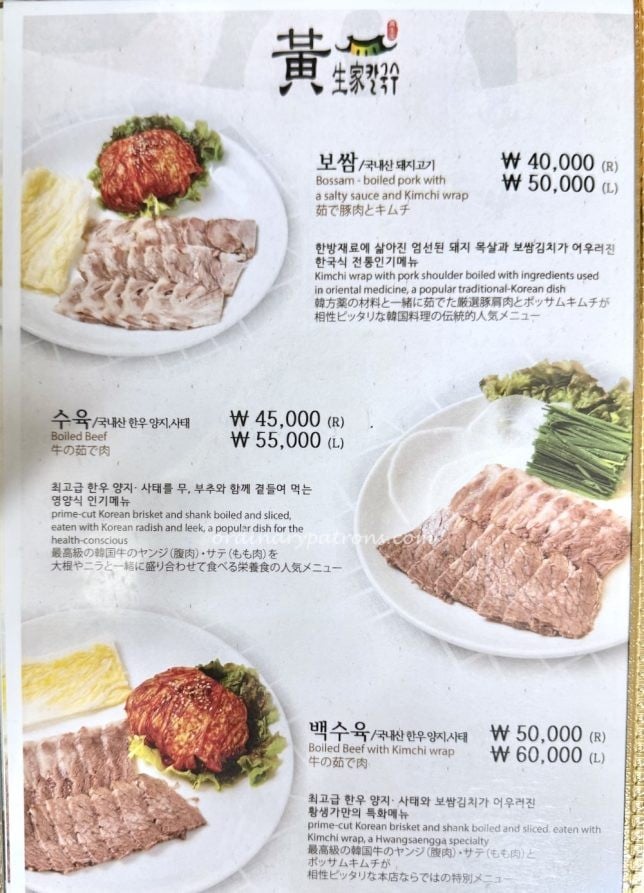 Here are pictures of some pages from the Hwangsaengga Kalguksu menu. Noodles and mandu are the highlights, in particular the mandu which we saw on all the tables around us. Some meat dishes are also available on the menu.