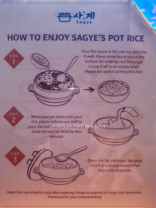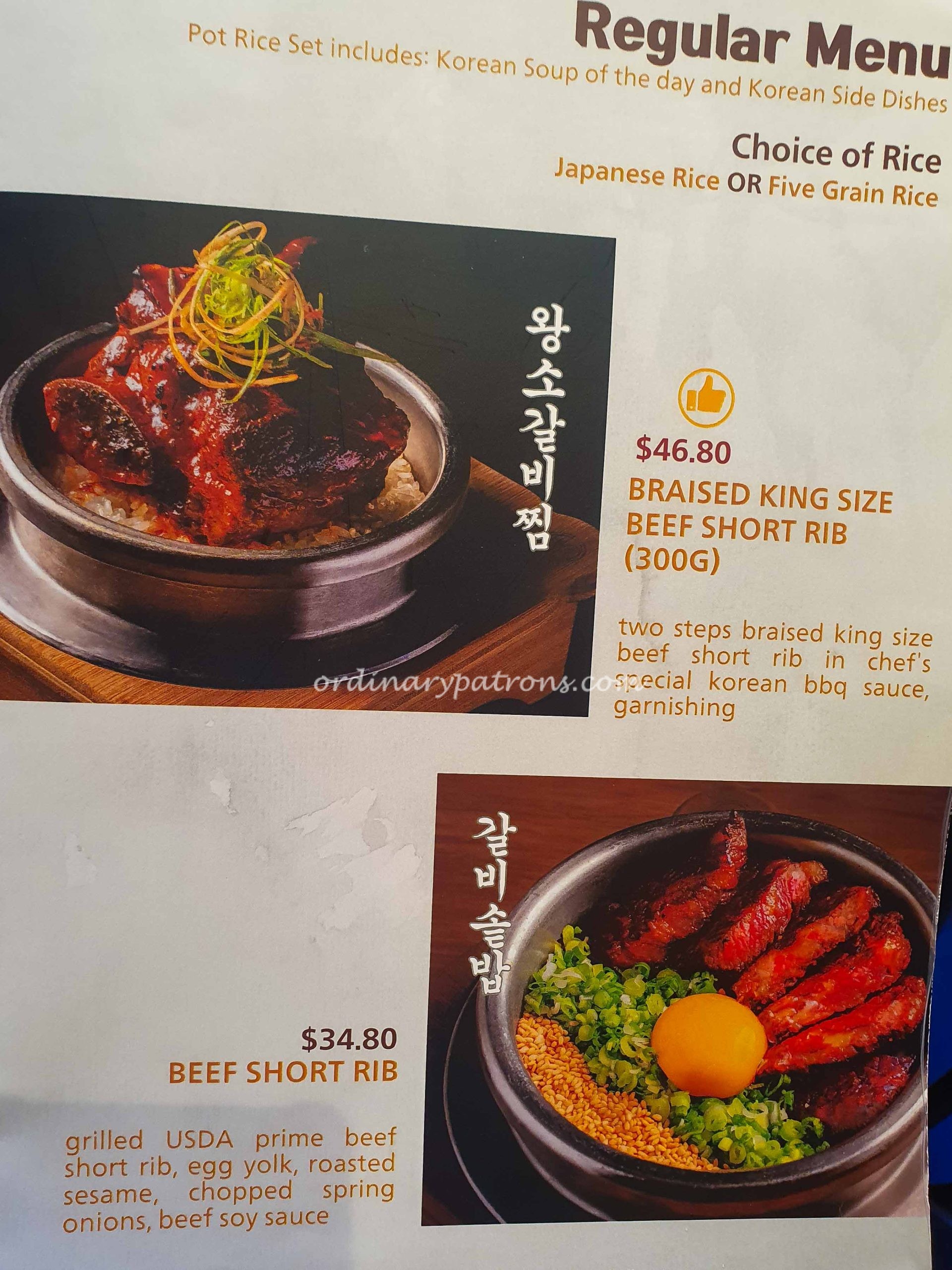 Here are pictures of some pages of the Sagye Korean Pot Rice menu. The restaurant menus are also available online on their Instagram page (link below). We decided on three types of pot rice – beef short rib ($34.80++), Kurobuta pork ($26.80++) and a “Netflix-Inspired Culinary Class Wars Dongpo Rou “.