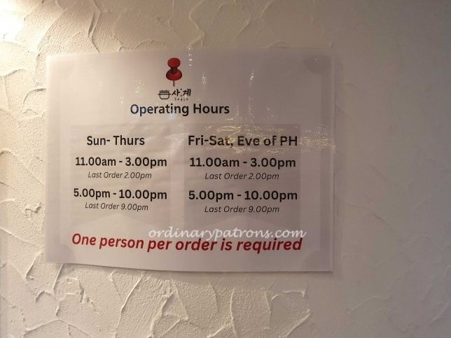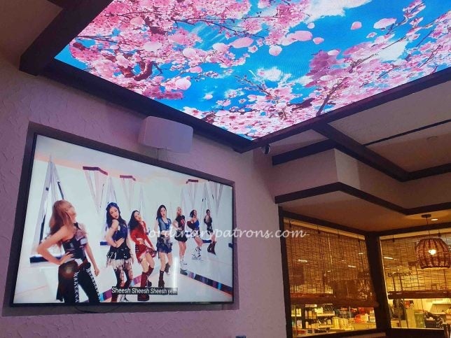 A large overhead screen displays scenes of Korean cherry blossoms while the TV screen on the wall provides non-stop K-pop videos (without audio) thoughout our lunch. It was a full house at the time of our lunch on a weekday. This is a no reservation, walk-in only restaurant.