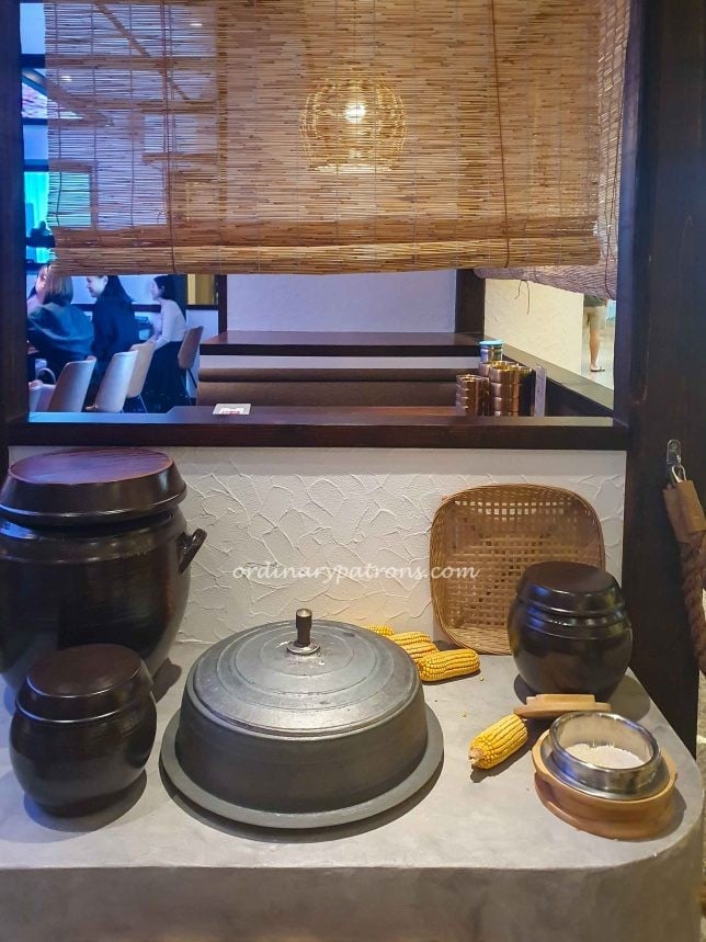 Diners visiting the new Sagye Korean Pot Rice restaurant at Wheelock Place are greeted by a mock-up of a traditional Korean cooking area. The design is a mix of traditional hanok-inspired interior decor and modern K-Pop entertainment. Traditional elements like bamboo curtains, lamps, Hangari pots, are intertwined with modern tech.