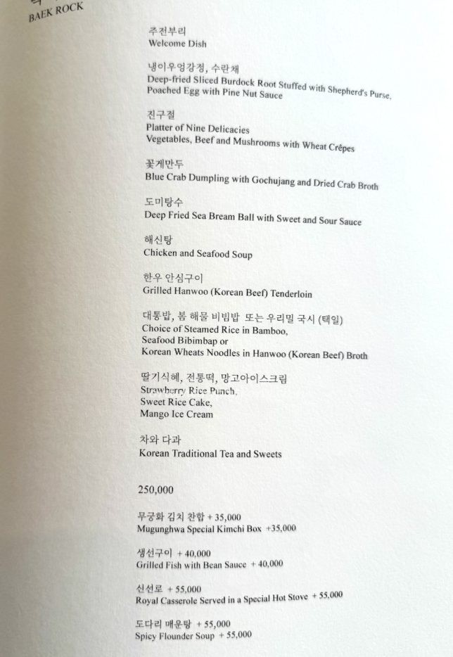 Like many fine dining restaurants these days, fixed course menus are offered at the restaurant, with the lunch menus being more affordable. The lunch menus ranged from KRW170,00 while dinner prices start from KRW210,000. We had lunch there and opted for the mid-range KRW180,000 Kum Kang menu. Here are pictures of some of the lunch menus.