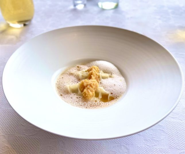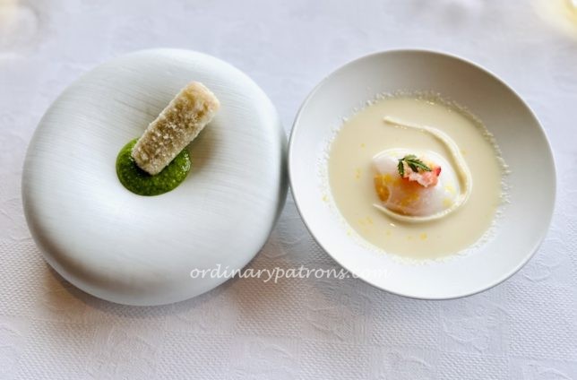 Next to arrive were deep-fried burdock root and poached egg (picture above), followed by crab dumpling in broth (picture below). These starters were elegant both visually and in taste. The beauty of the plating can rival some of the best we have seen in top French restaurants.