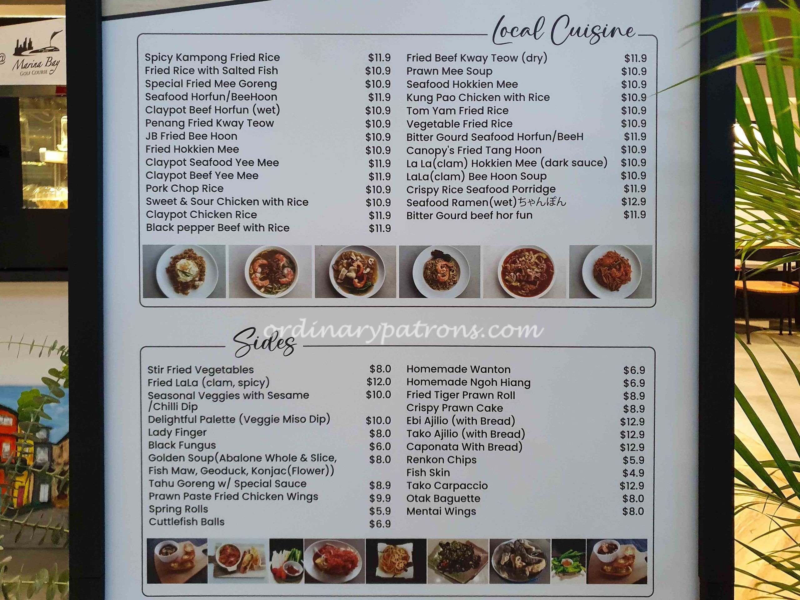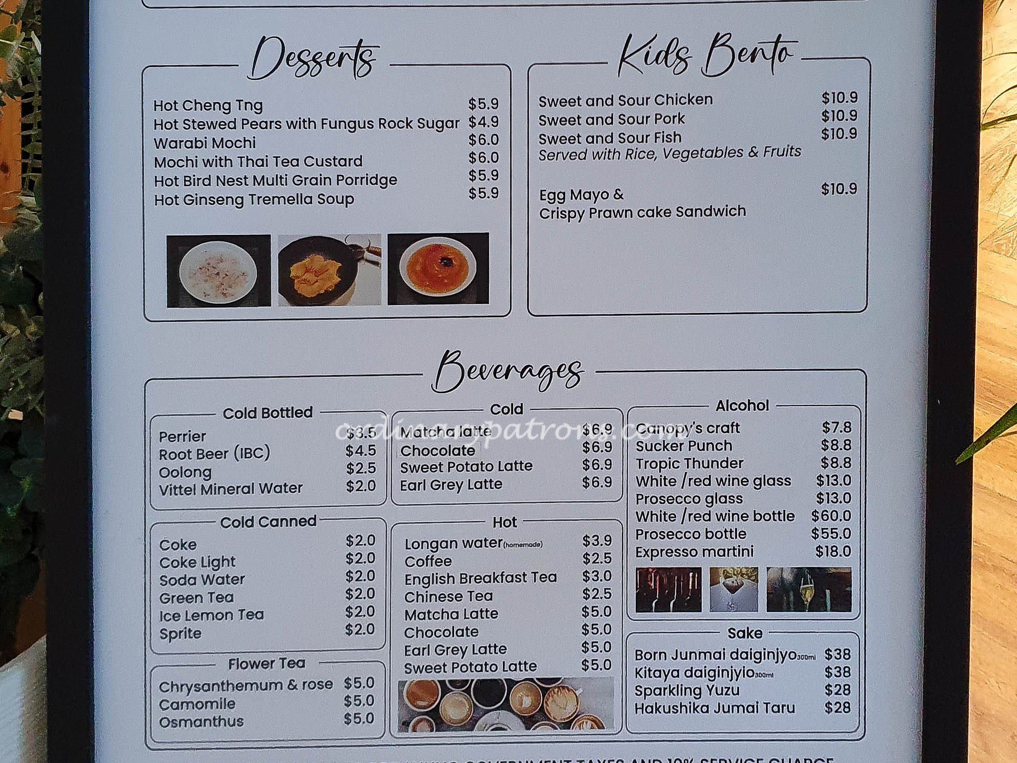 The menu of The Canopy Cafe in Katong V has a long list of one-dish meals, including the popular JB Fried Bee Hoon and Crispy Rice Seafood Porridge. The side dishes on the menu may in fact be more interesting – with options like Fried Lala, Ngoh Hiang and Otak Baguette. There are also desserts and beverages. The cafe also offers kids bento and an afternoon tea set.