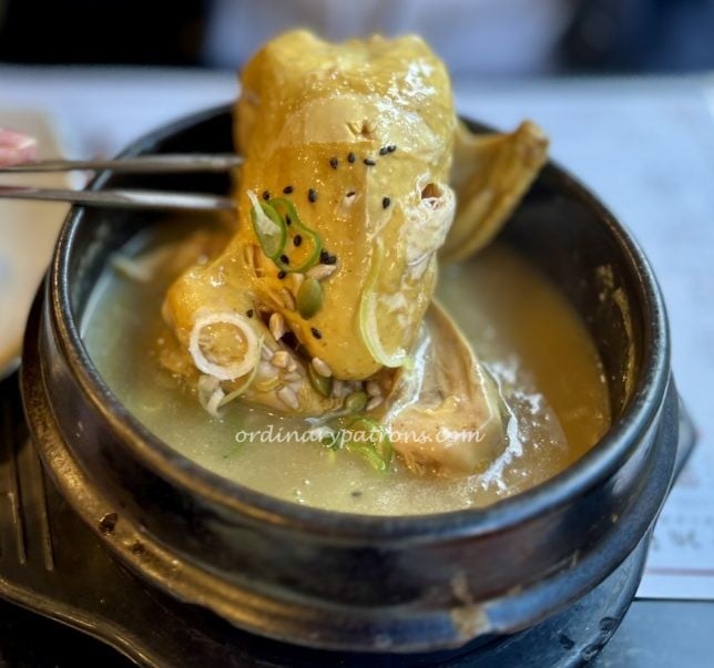 A few side dishes were served ahead of the main dishes. A cup of insamju (Korean liquor) was served to each diner. According to the instructions, it can be drank before, during or after the meal. We chose “during”. The main attraction, samgyetang, arrived soon after, bubbling away in a heavy stone pot. The pot was very effective in keeping the soup warm throughout the meal.