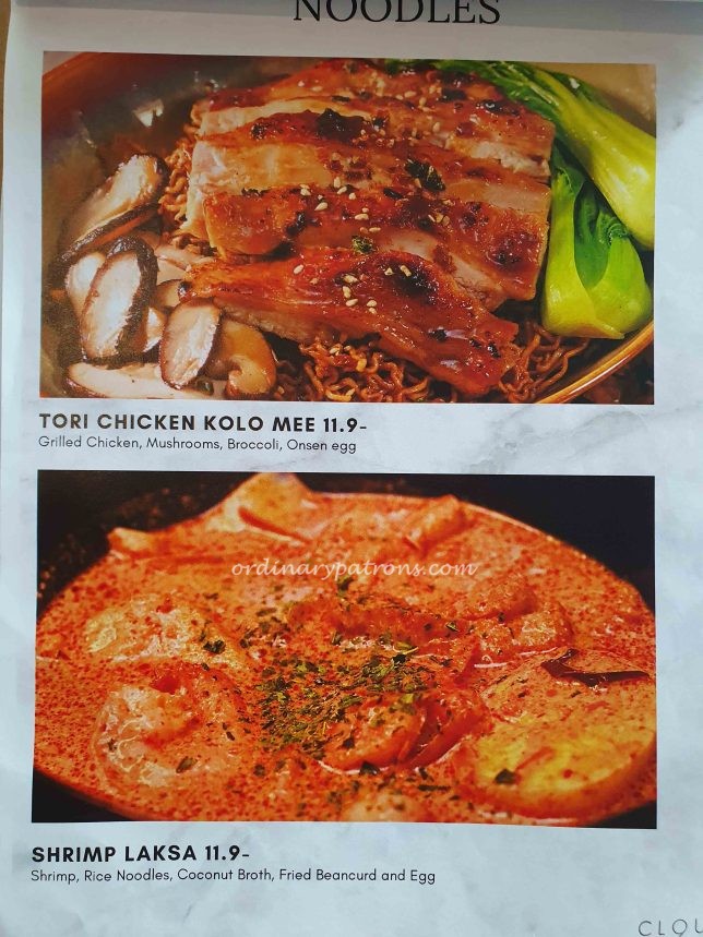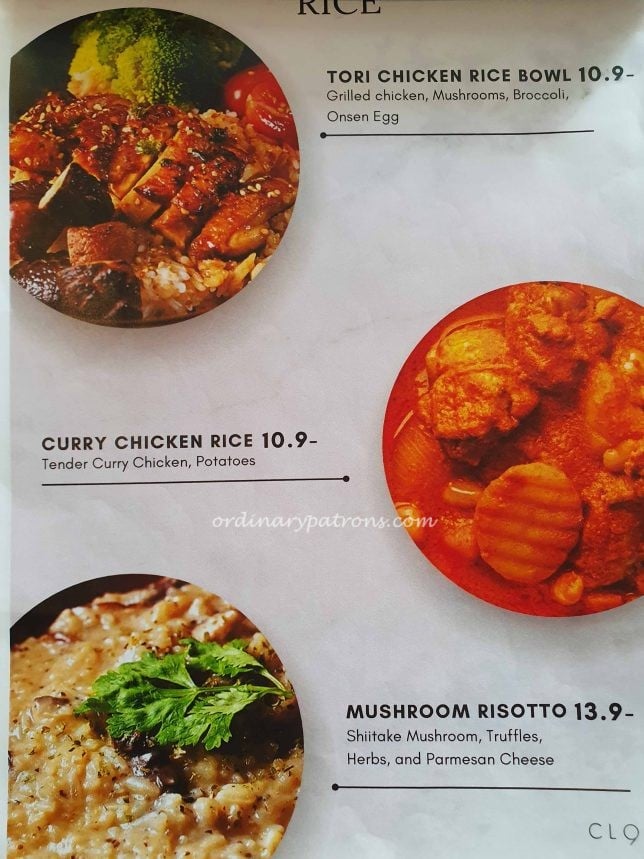 The menu of CL9UD Cafe has different sections: Rice, Noodles, Pastas, Burgers, Seafood and Sides. The Rice section features items that illustrate the diverse cuisines the chefs can prepare. There are Japanese-inspired Tori Chicken Rice Bowl, local Curry Chicken Rice and Western-style Mushroom Risotto.