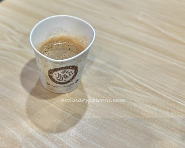 A paper cup popped out of the machine and a nozzle started filling it with coffee. It was a coffee with milk and sugar (no choice). The predominant taste was sweetness. Would be good for those who need something sweet to round up a meal.