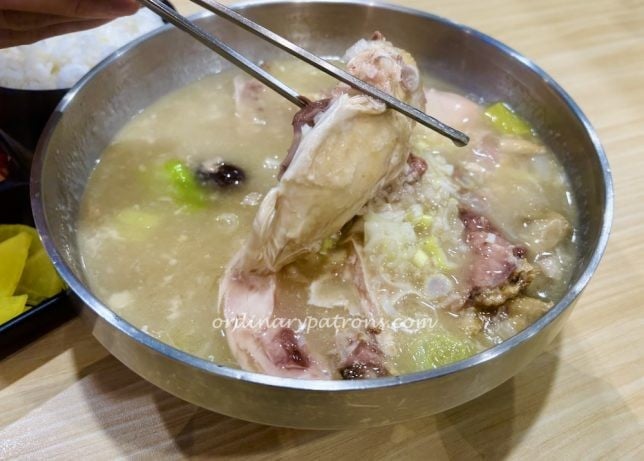 We were more intrigued by the Ssada Gimbab ginseng chicken stew because everything was submerged. The menu stated that a whole young chicken was used in the making of this dish. Some pickles and rice accompanied the soup.