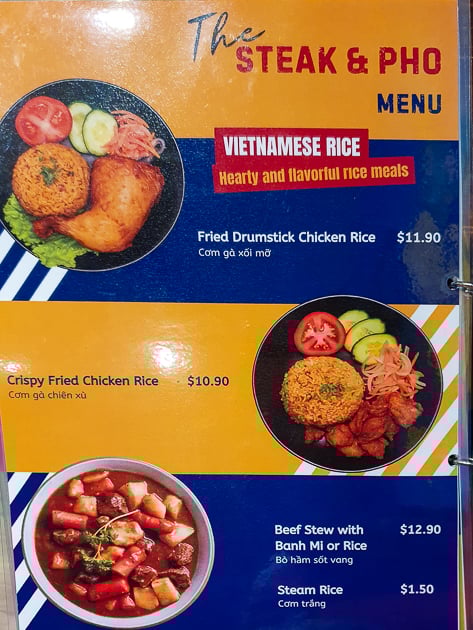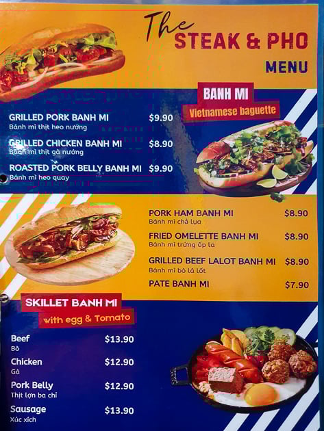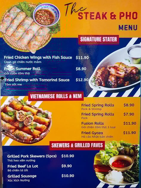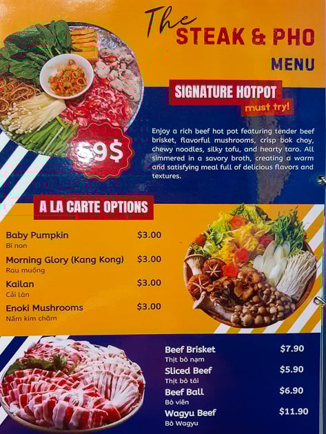 Steak and Phoโs menu is broad. There are sections for pho, banh mi and steaks, as well as vegetarian options. Hot pots are also featured. The variety suggests that the restaurant aims to appeal to both Vietnamese diners looking for home flavours and others seeking grilled meats and comfort food.