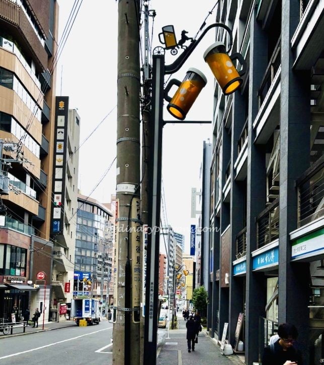 The buildings in this neighbourhood are not new but have interesting retro vibes. This wedge shaped building is the thinnest building I have seen and houses a restaurant serving takeaway food on the ground floor. The lamp posts in the area have beer mug shaped lamps! The newer and more touristy parts of Ebisu (including the Yebisu Beer Museum and Yebisu Garden Place shopping mall) are located about 500m to the south.